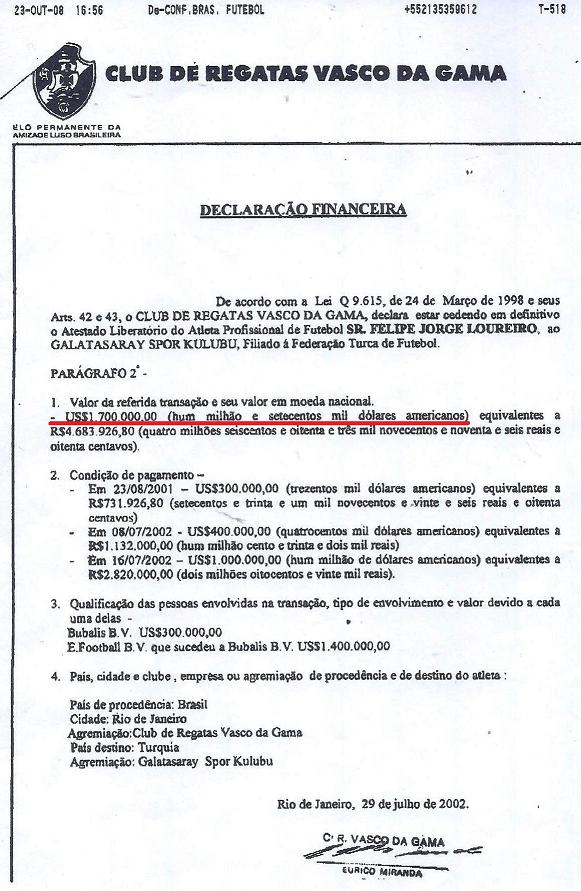 Embolsou cerca de US$ 2,3 milhões que deveriam ter sido depositados nos cofres vascaínos, ou nunca terem saído do caixa turco.
