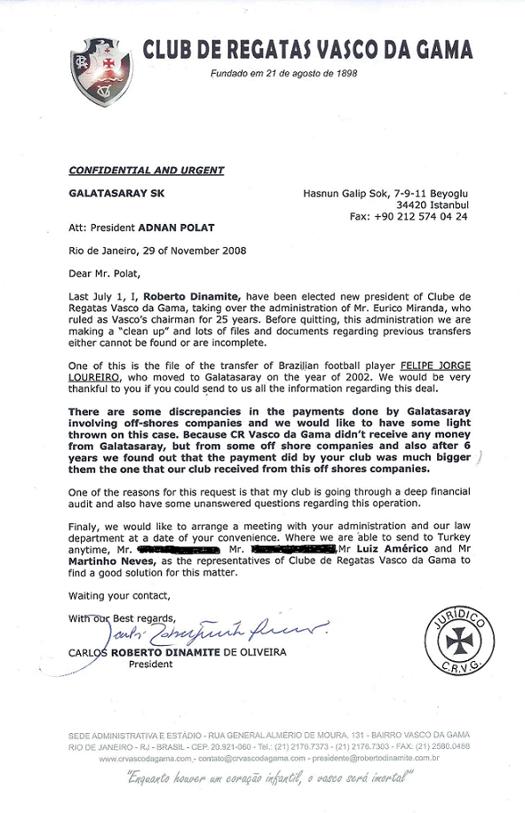 Pouco mais de um mês depois, Roberto Dinamite enviou carta ao Galatasaray cobrando a diferença de valores, citando até os depósitos em paraíso fiscal, comprovando que sabia de todo o esquema.