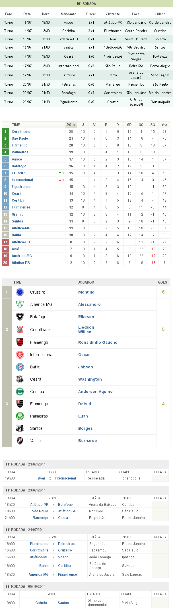 Terminada a 10ª rodada do Campeonato Brasileiro 2011, o Vasco, que derrotou o Atlético-PR por 2 a 1, subiu da 7ª para a 5ª colocação na tabela.