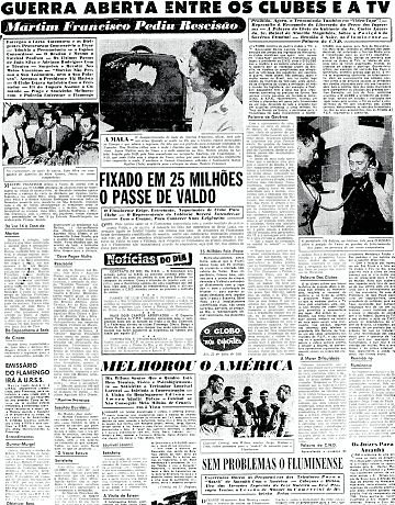 Últimos boletins da guerra clubes x TV: o governador Carlos Lacerda revogou a liberação dos preços dos ingressos do Maracanã; os clubes cariocas decidiram que agora nem mesmo em “vídeo-tape” permitirão a transmissão dos jogos. A guerra, todos sabem, não começou agora e muito menos no Brasil, pois há muito, logo depois da invenção da televisão, anda agitando os dirigentes de clubes e entidades de todo o mundo. Na Inglaterra, por exemplo, a Football Association tem a base dos seus argumentos contrários no prejuízo no futuro. Isso porque criaria gerações de torcedores comodistas.