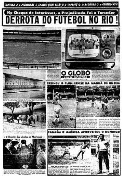 Desde sexta-feira, o caso clubes cariocas x TVs se aproximava de um ponto crítico. Naquele dia, sabedor de que os clubes não permitiriam a transmissão televisiva dos jogos de futebol, o governador da Guanabara, Carlos Lacerda, tornara sem efeito o aumento dos preços de ingressos no Maracanã. Em vista disso, aceitando a determinação governamental, as associações resolveram, em reunião realizada durante o baile de aniversário do Fluminense, manter o Campeonato Carioca, mas já sem conceder às televisões o direito a fazer o “vídeo-tape” das partidas, concessão que fôra considerada plausível e que não sofreria taxação de espécie alguma. No entanto, quando tudo parecia definido, com os clubes resguardando e defendendo os seus direitos, houve um telefonema do Sr. Rafael de Almeida Magalhães, chefe do gabinete do governador, para a residência do presidente da Federação Carioca de Futebol (FCF), Antônio do Passo. Os relógios marcavam quase 19h de sábado, e aquela autoridade estadual comunicava ao dirigente da entidade que o governador baixara portaria dando pleno acesso das TV ao Maracanã, taxando-lhes as transmissões e, como complemento à medida, distribuindo a taxa entre entidades que escolheria. No primeiro instante, o presidente da FCF quis retrucar, debater o assunto, porém, percebeu logo que o Sr. Rafael de Almeida Magalhães não teria competência alguma para tomar providências, ainda mais que o governador se retirara para o fim de semana em Brocoió. Sábado, à noite, no Flamengo, foi distribuída a seguinte nota oficial: “Diante da resolução do Exmo. Sr. governador, proibindo a realização de jogos de futebol no Maracanã, desde que não sejam televisionados, a Federação Carioca de Futebol, reunida na sede do C. R. Flamengo, depois do pronunciamento dos clubes, resolveu suspender o início do campeonato, programado para 23 do corrente, até ser encontrada solução que concilie seus interêsses, mediante audiência a ser solicitada ao Sr. governador do estado. Outrossim, resolveu a entidade não apreciar os têrmos da resolução do Exmo. Sr. Governador, julgando não estar S. Excia. esclarecido do momentoso assunto”.