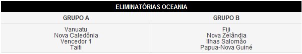 A Oceania tem a Nova Zelândia, Fiji, Nova Caledônia, Vanuatu, Ilhas Salomão, Taiti e Papua-Nova Guiné diretamente classificadas para a fase de grupos.