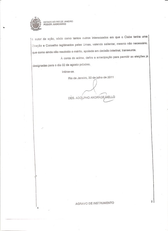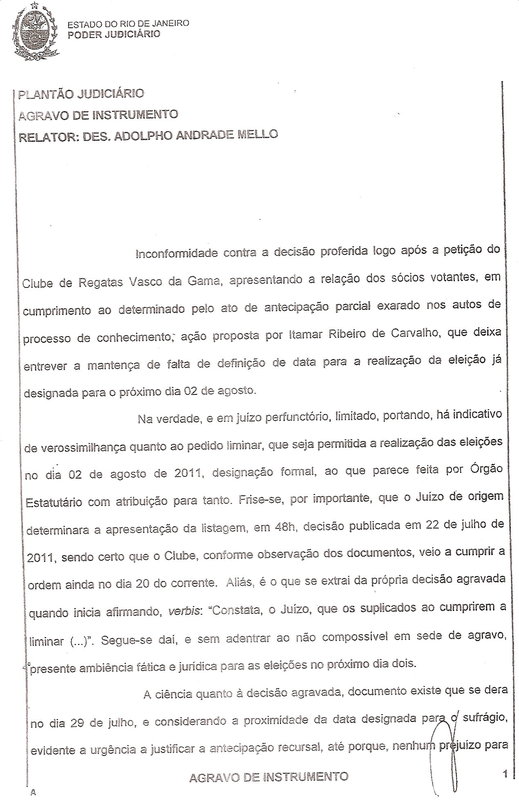 O Club de Regatas Vasco da Gama informa que, em decisão tomada agora há a pouco, o Juízo de plantão manteve para a próxima terça-feira, dia 2 de agosto, a eleição para escolher o presidente, o vice-presidente, os membros eletivos, efetivos e suplentes do Conselho Deliberativo do clube para o triênio 2011/2014.