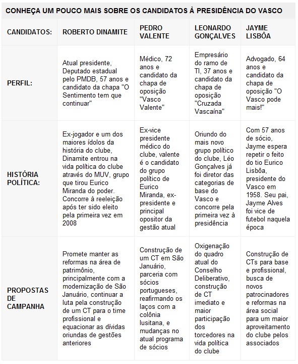 Após cerca de três meses de um processo eleitoral marcado por polêmicas, acusações entres as chapas e uma "batalha de liminares", que ameaçaram a realização da mesma até poucas horas antes do início previsto, o Vasco realiza, nesta terça-feira, a partir das 9h, a eleição que irá apontar o presidente do clube para o triênio 2011/12/13. A votação que só deverá conhecer o seu vencedor na madrugada de quarta-feira, terá direito ainda a um tapete vermelho para os associados que participarem do pleito e um verdadeiro esquema de guerra nos arredores da sede histórica de São Januário.