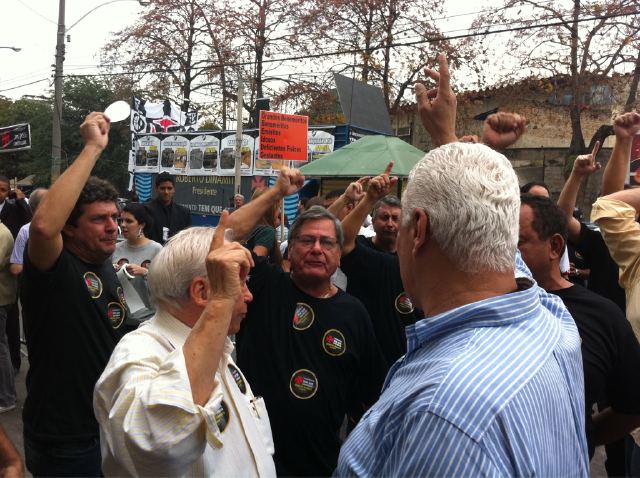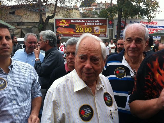 Anônio Soares Calçada, presidente de honra do Vasco da Gama, acaba de chegar em São Januário para votar. Antigo mandatário, considerado o melhor da história do Vasco, carrega um adesivo de Roberto Dinamite na blusa.