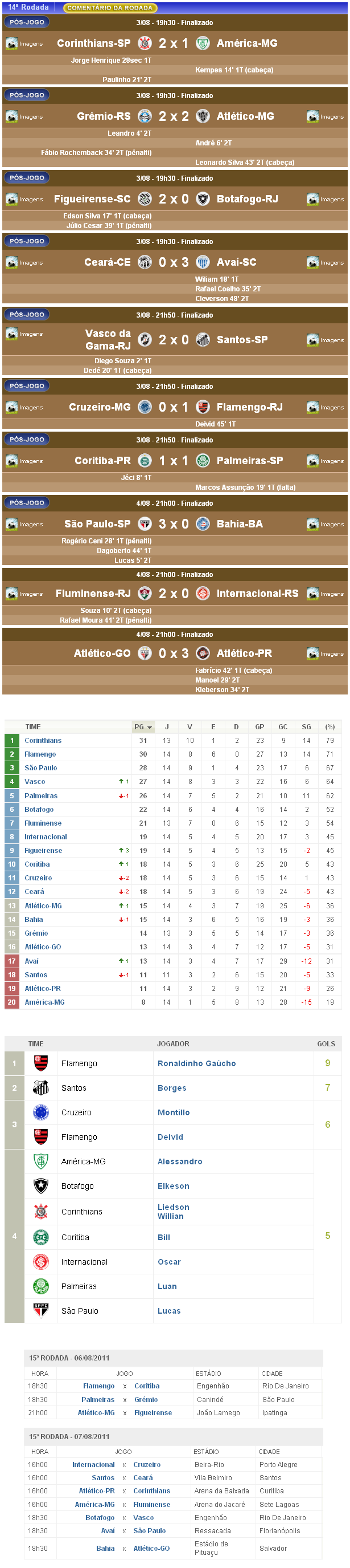 Terminada a 14ª rodada do Campeonato Brasileiro 2011, o Vasco, que derrotou o Santos por 2 a 0, subiu da 5ª para a 4ª colocação na tabela. A distância entre o Gigante da Colina e o líder Corinthians segue sendo de 4 pontos.