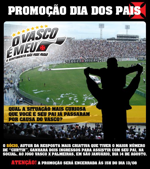 O Sócio, autor da resposta mais criativa que tiver o maior número de "Curtir", ganhará dois ingressos para assistir com seu pai, na Social, ao jogo Vasco x Palmeiras, em São Januário, dia 14 de agosto.
