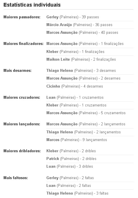 PALMEIRAS: Marcos, Cicinho, Henrique (Maurício Ramos), Thiago Heleno e Gerley; Márcio Araújo, Marcos Assunção, Patrik (Vinicius) e Maikon Leite (Dinei); Luan e Kleber