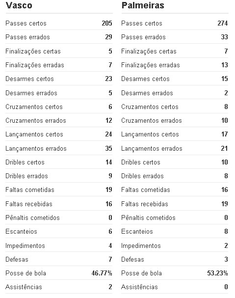 ![]() Estatísticas de Vasco 2 x 0 Palmeiras | ![]() Estatísticas de Vasco 2 x 0 Palmeiras | ![]() Estatísticas de Vasco 2 x 0 Palmeiras |