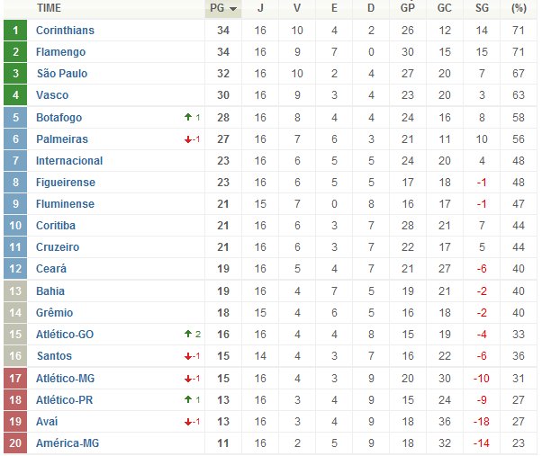 Terminada a 16ª rodada do Campeonato Brasileiro 2011, o Vasco, que venceu o Palmeiras por 1 a 0, permaneceu na 4ª colocação na tabela. A distância entre o Gigante da Colina e o líder Corinthians passa a ser de 4 pontos.