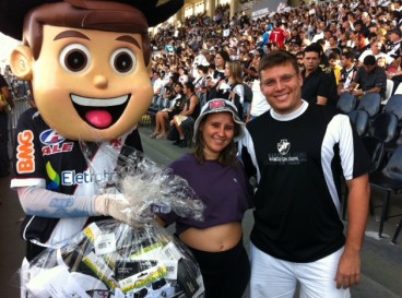 É que os papais vascaínos que tivessem um filho com até três meses de idade ou se trouxessem as mamães grávidas recebiam das mãos do Mascote vascaíno um kit com mais de dez produtos licenciados do clube, todos fornecidos pela empresa Torcida Baby.