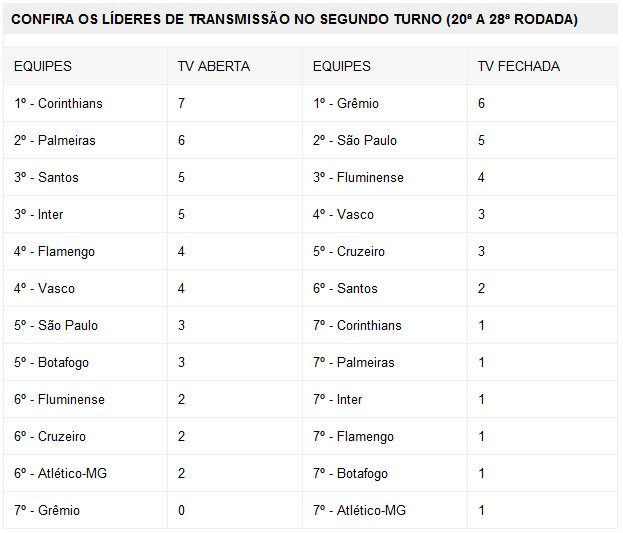 Mas a surpresa do levantamento ficou para o Flamengo. Único invicto do campeonato, com o astro Ronaldinho Gaúcho em grande fase e a maior torcida do país, o time rubro-negro terá apenas quatro jogos na TV aberta (quarto melhor) e um na fechada. No primeiro turno, o Flamengo foi o terceiro melhor na aberta (apareceu dez vezes) e também foi 'medalha de bronze' no geral, com 13 aparições.