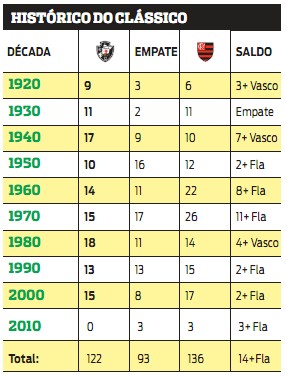 Em seis confrontos nesta década, o Vasco ainda não venceu o Flamengo. Foram três derrotas e três empates. Nos anos 2000, apesar do domínio do Rubro-Negro — que ganhou seis Estaduais e dois títulos nacionais —, os vascaínos só venceram duas partidas a menos do que o rival. Para os torcedores mais jovens do Vasco, o jogo de hoje marca outra chance de ver novamente um equilíbrio no duelo, depois de tempos de supremacia rubro-negra.