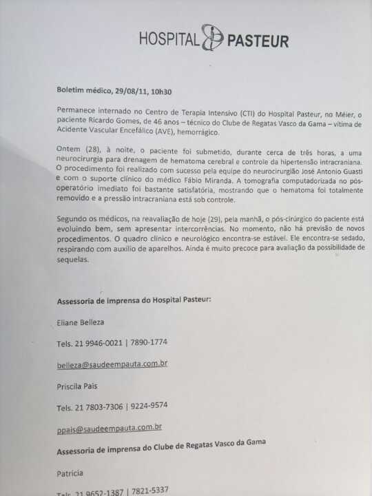 Confira o boletim médico de Ricardo Gomes da manhã desta 2ª-feira