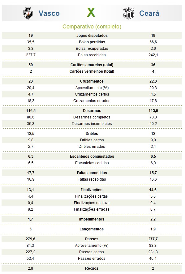 Confira o comparativo das estatística de Vasco e Ceará no Brasileiro