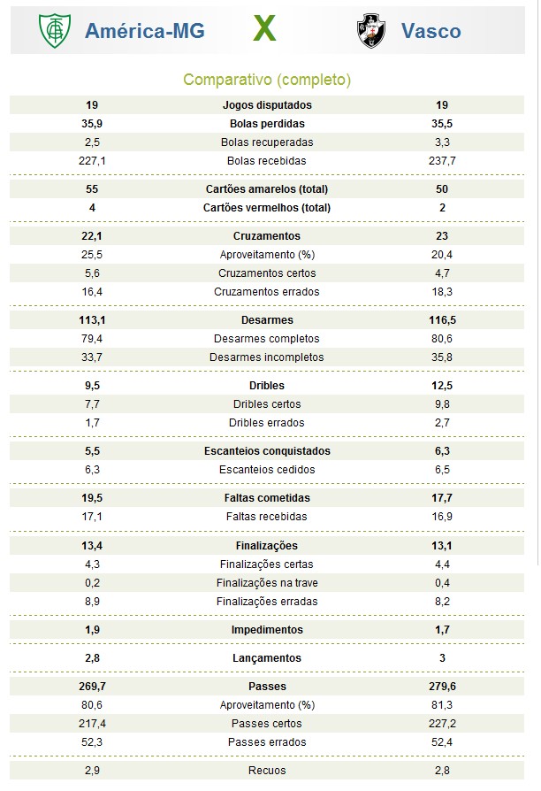 Confira comparativo das estatísticas de América-MG e Vasco no Brasileiro