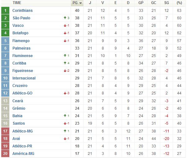 Terminada a 21ª rodada do Campeonato Brasileiro 2011, o Vasco, que perdeu para o América-MG por 4 a 1, caiu para a 3ª colocação na tabela, ultrapassado pelo São Paulo. A distância entre o Gigante da Colina e o líder Corinthians segue em 2 pontos.