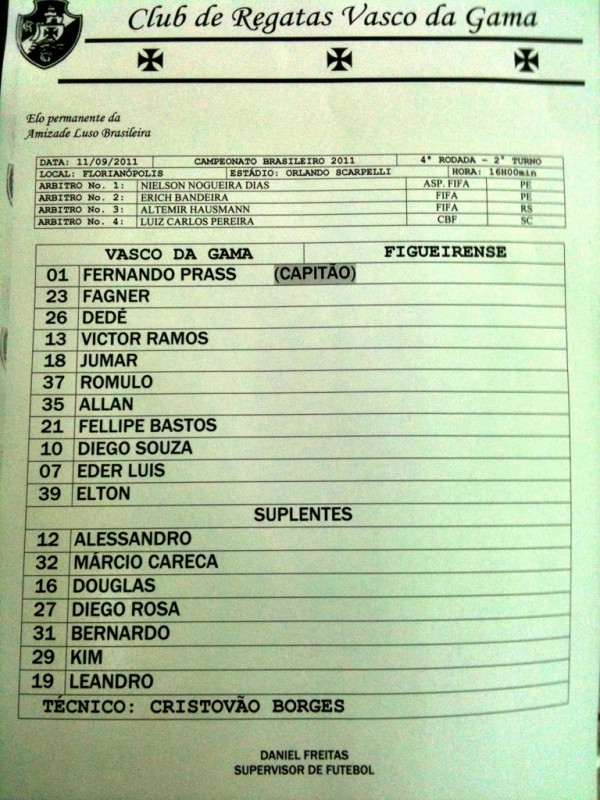 10/09 Confira as prováveis escalações de Figueirense e Vasco
