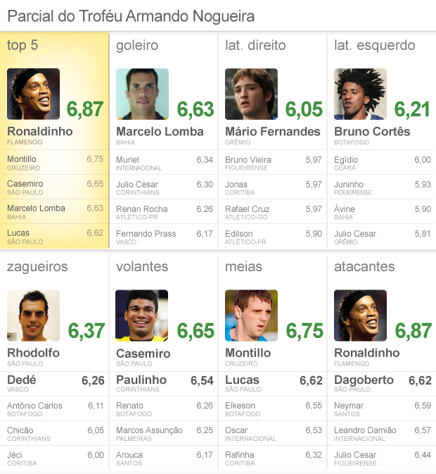 Quem caiu de produção e já não figura entre os cinco melhores da competição é Neymar. Sem marcar sequer um gol há cinco jogos do Brasileirão, a joia do Santos tem média 6,59. Casemiro (São Paulo), Marcelo Lomba (Bahia) e Lucas (São Paulo) completam a lista dos top 5 do Armandão.