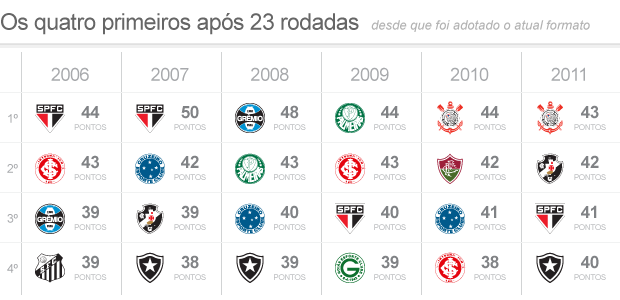 Curioso é notar que, nos últimos três Brasileirões, após a 23ª rodada, liderava a competição uma equipe que não acabou campeã. Abaixo, um panorama completo das edições desde 2006 quando da 23ª rodada.