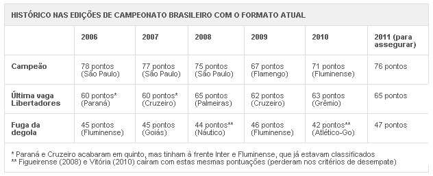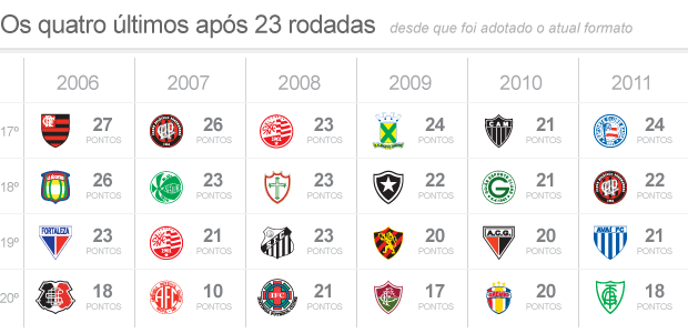 Na outra ponta da tabela, a projeção do matemático para quem quer escapar do rebaixamento aponta a marca de 47 pontos. Historicamente, o pior quadro se deu em 2009, quando o Coritiba, com 45 pontos, acabou rebaixado. Em 2010, por outro lado, o Atlético-GO escapou com 42. Mas, por enquanto, segurança mesmo só chegando a 47.