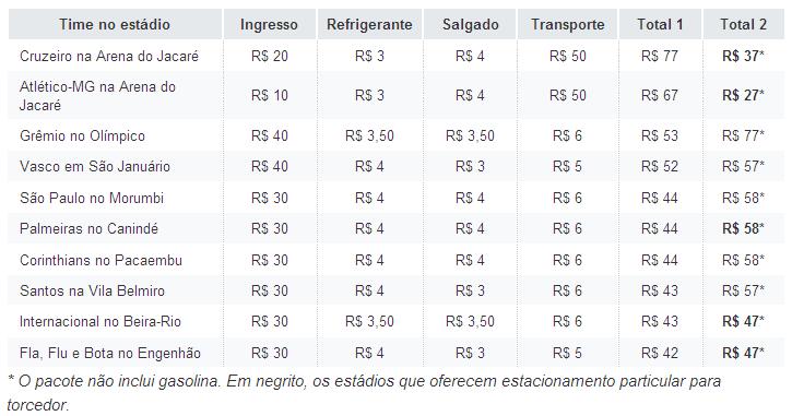 Na tabela abaixo, "Total 1" corresponde ao kit mais barato, com transporte público. O "Total 2" inclui o preço do torcedor que gastará com estacionamento, seja ele particular ou na rua, deixando dinheiro na mão dos "flanelinhas". Esse pacote não considerou gasolina.