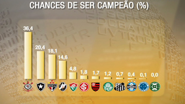 Botafogo aparece em segundo lugar, com 20,4%. Em seguida, na sequência de classificação: São Paulo, Vasco, Fluminense, Internacional, Flamengo, Palmeiras, Santos, Grêmio, Cruzeiro e Coritiba, como times que têm chances de conquistar o título brasileiro.