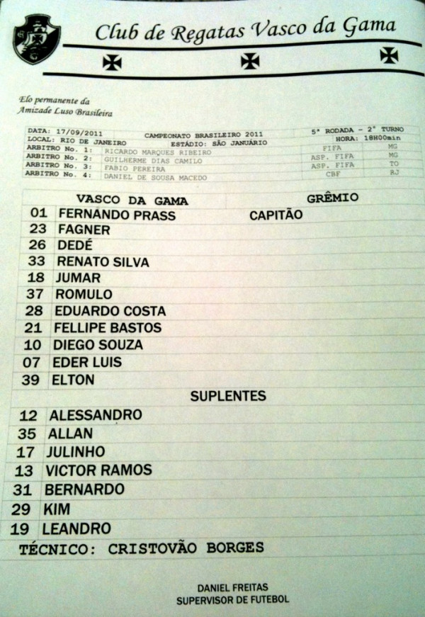 Vasco oficialmente escalado com Fellipe Bastos e Jumar