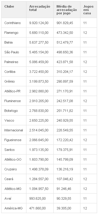 Com exceção de 2006, quando o São Paulo teve a maior arrecadação do Brasileiro, Flamengo e Corinthians têm se revezado como o clube com maior renda. O Corinthians levou o 'título' em 2004 (R$ 4.292.253), 2005 (R$ 7.160.445) e 2010 (R$ 17.092.403), enquanto o Fla conseguiu os melhores números em 2007 (R$ 9.029.116), 2008 (R$ 12.586.681) e 2009 (R$ 14.555.039).