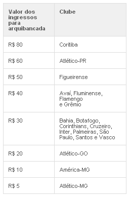O torcedor que gosta de ficar nas cadeiras cobertas do Pacaembu - área VIP - em jogos do Corinthians precisa estar preparado para gastar. O ingresso para o setor custa R$ 180, o mais caro do Brasil. No entanto, levando em consideração o valor cobrado nas arquibancadas pelo país, o Coritiba é o clube que cobra o preço mais alto: R$ 80.
