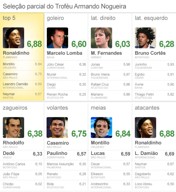 A liderança geral, porém, segue disputada entre Ronaldinho Gaúcho, do Flamengo, e Montillo, do Cruzeiro. Suas equipes vivem mau momento na competição, o que reflete também a queda de suas médias. Se o craque rubro-negro hoje está com 6,88, o argentino se mantém com 6,84, na cola de R10. Isso acabou diminuindo a diferença entre os dois para apenas 0,04. Quem aparece entre os cinco após 24 jornadas é Neymar. A nota 7,5 por sua atuação na vitória do Santos sobre o Corinthians subiu a média da joia do Peixe para 6,67, tirando do páreo, por ora, o goleiro Marcelo Lomba, do Bahia.