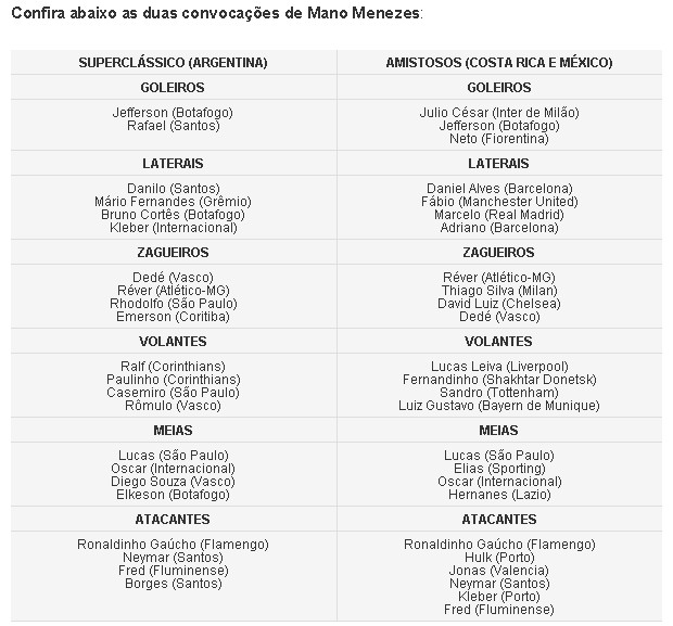 O técnico Mano Menezes divulgou nesta quinta-feira, em São Conrado, na Zona Sul do Rio de Janeiro, as duas listas de convocados da Seleção Brasileira para o duelo contra a Argentina, na próxima quarta-feira, no Mangueirão, em Belém, e para os amistosos diante da Costa Rica, dia 7, em San José, e México, no dia 11, em Torreón. A grande ausência no grupo chamado pelo comandante é o atacante Leandro Damião, que sofreu uma lesão muscular na última quarta-feira, atuando pelo Internacional. Ronaldinho Gaúcho e Neymar vão participar dos três jogos.