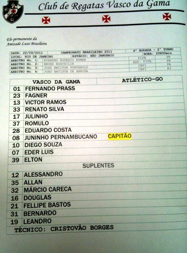 21/09 Confira as prováveis escalações de Vasco e Atlético-GO