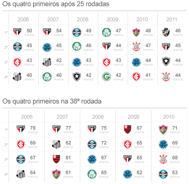 Nas últimas cinco edições, pelo menos dois times que estavam no G-4 na 25ª rodada também estavam ali no fim do campeonato. Em 2006, foram os mesmos quatro times.