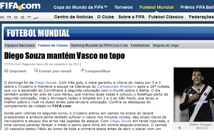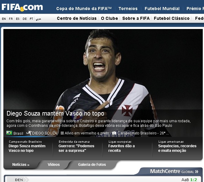O domingo foi de Diego Souza. Com três gols, o meia garantiu a vitória do Vasco por 3 a 0 sobre o Cruzeiro e manteve a equipe na liderança do Campeonato Brasileiro após a 26ª rodada, que viu a ascensão do Corinthians à segunda colocação com o triunfo sobre o Bahia. O dia também poderia ter sido de Loco Abreu, que marcou duas vezes e colocou o Botafogo perto da segunda colocação, mas o Alvinegro cedeu o empate em 2 a 2 ao São Paulo, que levou a melhor sobre o rival no duelo direto pela terceira colocação. Confira os destaques do complemento da rodada no FIFA.com.
