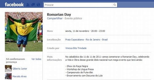 Em 11 de novembro de 2011 (11/11/11), uma grande comemoração vai celebrar a vida e obra de Romário, o mais famoso dono da camisa 11 da seleção brasileira. É o que promete o "evento público" criado no Facebook pelo gaiato Vinicius Trindade. Batizada de Romarian Day, a festa - que é uma brincadeira, é claro - será realizada na Praia de Copacabana e terá show do Raça Negra, workshop de língua presa, campeonato de futevôlei e encerramento com discurso do Lula. Começa onze da manhã e termina onze da noite, é lógico.