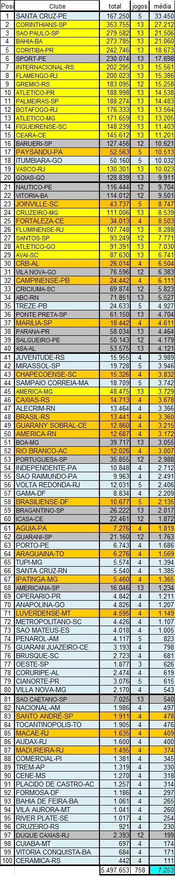 # O ranking é feito apenas com os torcedores pagantes e levando em conta os públicos dos mandantes das partidas.