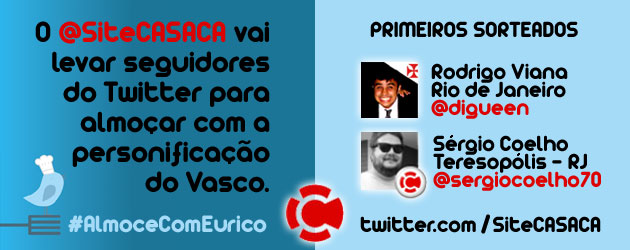 Os vascaínos @digueen (Rodrigo Viana, Rio de Janeiro) e @sergiocoelho70 (Sérgio Coelho, Teresópolis-RJ) foram os primeiros sorteados da inédita promoção #AlmoceComEurico. Eles almoçarão com o Eterno Presidente Eurico Miranda, o dirigente mais vitorioso do futebol brasileiro, em um restaurante sofisticado no Centro do Rio de Janeiro.
