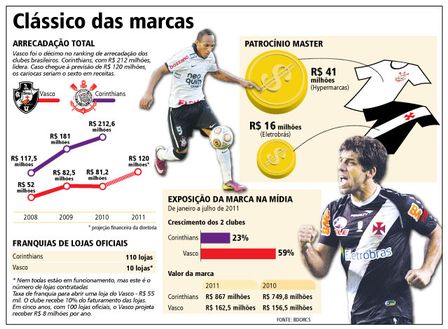 Marca mais valiosa do futebol do Brasil — avaliada em R$ 867 milhões, muito superior aos R$ 162,5 milhões do Vasco —, o Corinthians teve acréscimo de 17% na receita total do clube na comparação de 2009 com o ano passado. De dois anos para cá, o aumento foi de 81%.