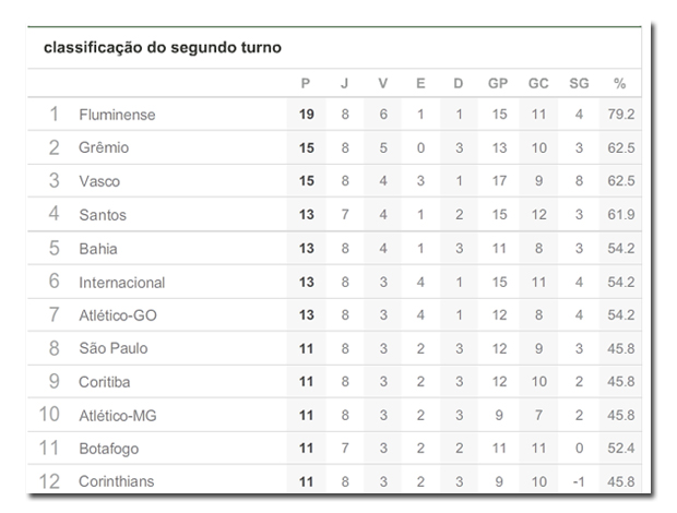 Com seis vitórias em oito partidas, o Fluminense é o líder do segundo turno do Campeonato Brasileiro, marcando o ótimo aproveitamento de 79,2% dos pontos. Após um começo bastante irregular na competição, o Tricolor parece ter se encontrado e contabiliza apenas uma derrota no returno, retrospecto que deixa a equipe do técnico Abel Braga a quatro pontos do Grêmio, segundo melhor time nesta faixa da competição ao lado do Vasco, que tem uma vitória a menos.