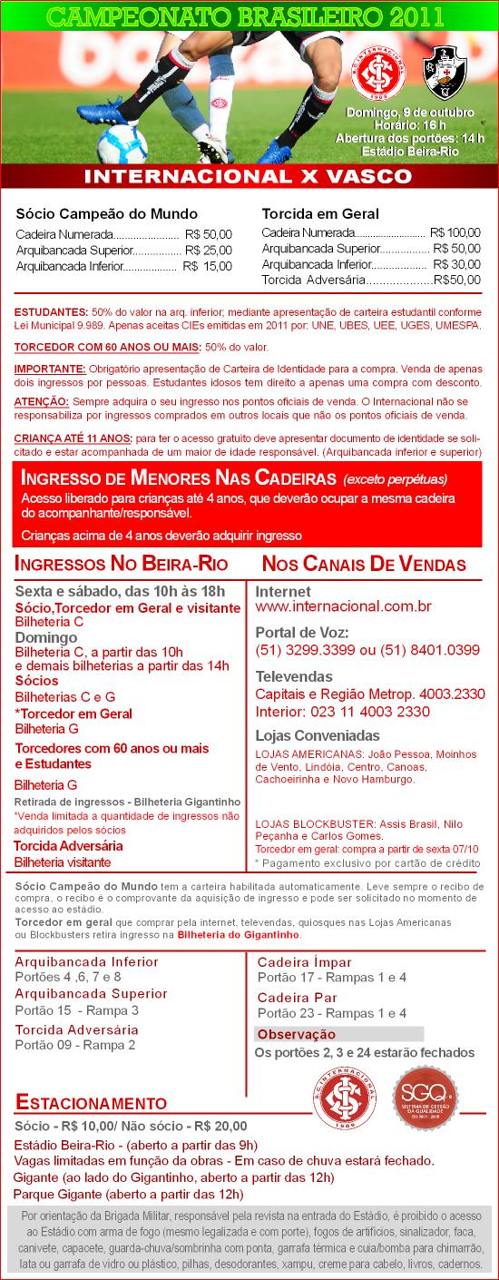 As bilheterias do Beira-Rio serão abertas a partir desta sexta-feira para a venda de ingressos para o jogo entre Inter e Vasco, domingo, em Porto Alegre. A venda vai das 10h às 18h – horário também válido para o sábado. Para quem quiser antecipar a compra, é possível adquirir acesso pela internet e demais canais de venda do Inter (mais informações em www.internacional.com.br).