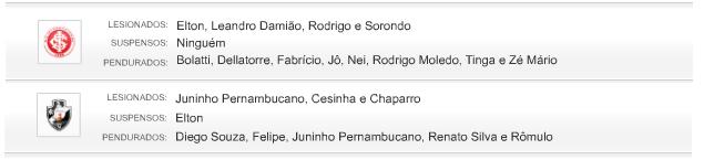 Confira suspensos, lesionados e pendurados de Internacional e Vasco