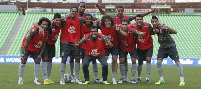 LARANJA: Neto, Lucas, Daniel Alves, Luiz Gustavo, Hernanes, Thiago Silva, David Luiz, Marcelo, Hulk, Dedé e Ronaldinho.