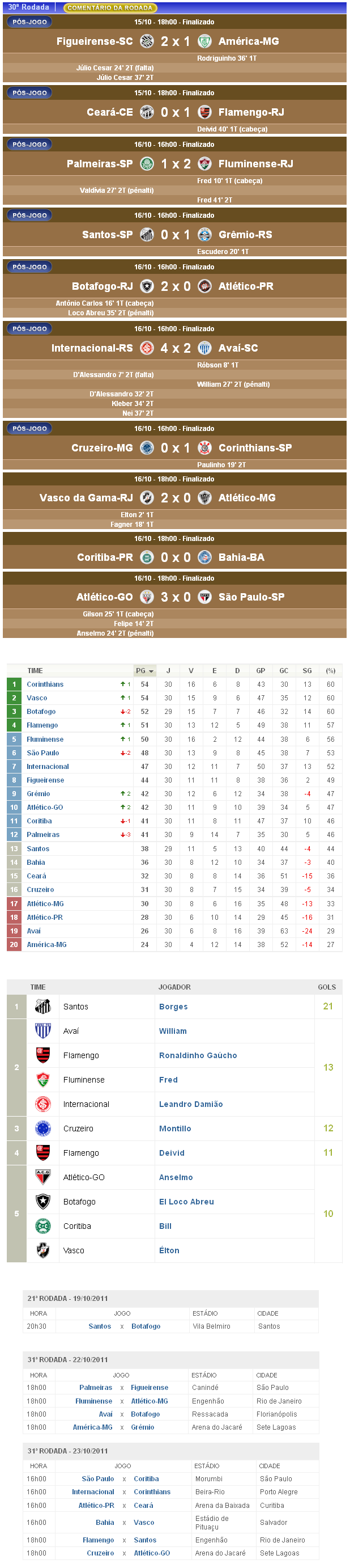 Terminada a 30ª rodada do Campeonato Brasileiro 2011 (a 11ª do returno), o Vasco, que derrotou o Atlético-MG por 2 a 0, manteve-se na 2ª colocação na tabela e empatado em nº de pontos ganhos com o líder Corinthians. O desempate se dá pelo critério do nº de vitórias (16 do Corinthians contra 15 do Vasco).