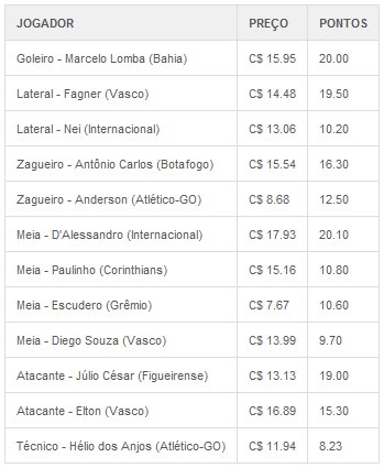 Apenas meio ponto atrás, aparece Júlio César, atacante do Figueirense, que marcou dois gols contra o América-MG, recebeu duas faltas, roubou uma bola, teve duas finalizações defendidas, e outra que foi para fora. Completa a lista dos cinco maiores pontuadores, o goleiro Rafael, do Santos: 17.50 pontos conquistados, apesar da derrota do Santos para o Grêmio por 1 a 0. Ele fez seis defesas difíceis, defendeu um pênalti que ele mesmo cometeu, mas só não evitou o gol de Escudero no rebote.