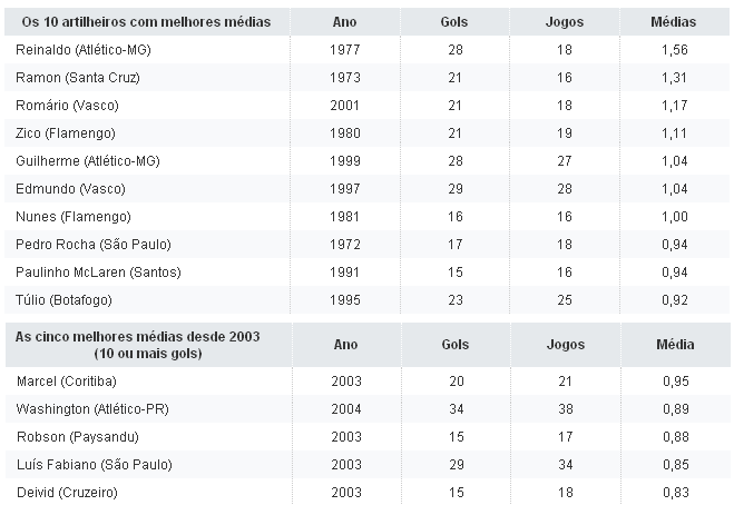 Um dos maiores artilheiros da história do país, Reinaldo não entrou na onda do desapego. Ele ainda se considera o maior goleador da competição. Com uma média fantástica de 1,56 gol por jogo, está longe de ser superado. Apenas outros seis jogadores conseguiram superar a média de um gol por jogo desde 1971. Ramon, do Santa Cruz, em 1973, foi quem mais se aproximou de sua marca, com 21 gols em 16 jogos (1,31). Romário, no Vasco, chegou a 1,17 em 2001.