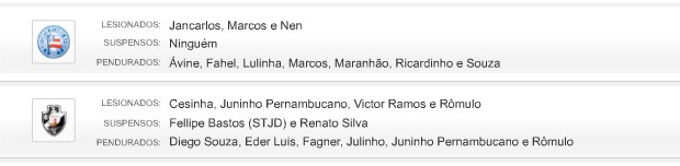 Confira suspensos, lesionados e pendurados de Bahia e Vasco