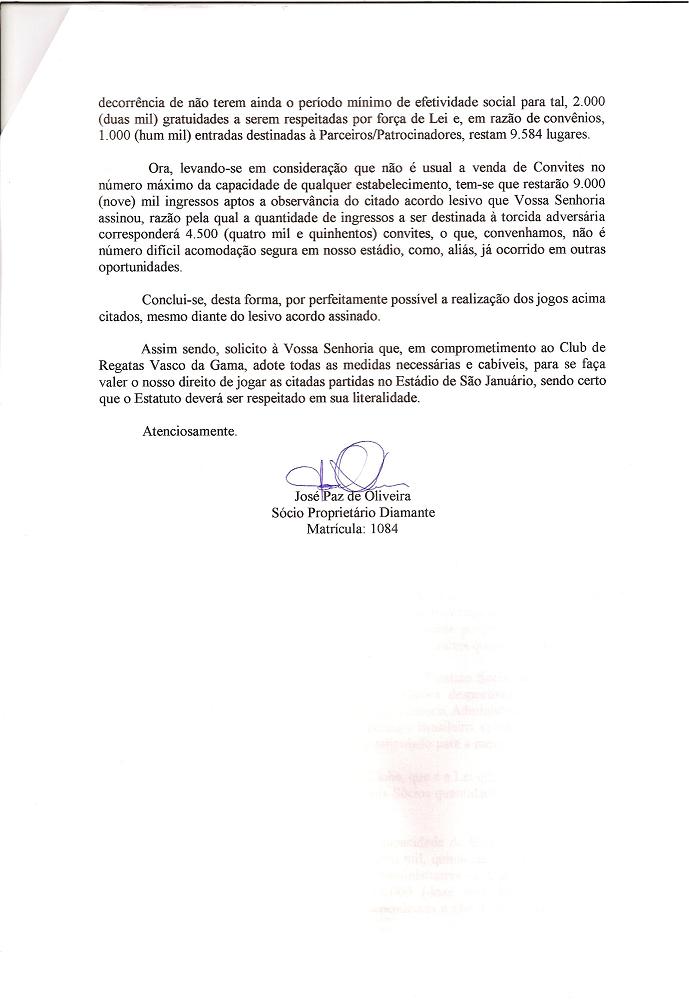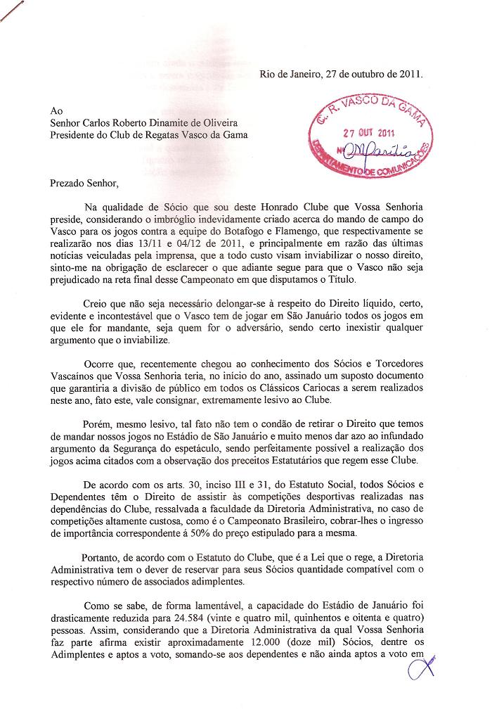 O CASACA! protocolou hoje, na secretaria do clube, uma carta onde esmiuça todo o procedimento que a diretoria do Vasco da Gama deve tomar para que seja viável a realização dos clássicos em São Januário, mesmo tendo ela assinado um acordo lesivo ao clube.