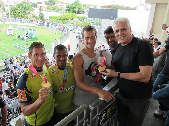 Os vascaínos do remo, campeões nos Jogos Pan-Americano, em Guadalajara, foram homenageados pelo presidente Roberto Dinamite neste domingo (30/10), no intervalo de Vasco e São Paulo, em São Januário. Os argentinos Ariel Soarez e Cristian Rosso conquistaram o ouro no Double four skiff e no skiff duplo. Ariel Suarez também conquistou o bronze no oito com.