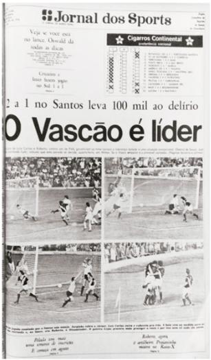 O Vasco é líder. Com uma vitória de 2 a 1 sobre o Santos, levou 100 mil torcedores ao delírio no Maracanã. Um time de muita garra, de muita tradição e bem a gosto de sua torcida, foi o que se viu, ontem, no Mário Filho, na sensacional vitória de 2 a 1 sobre o Santos de Pelé e Clodoaldo. Luís Carlos fez 1 a 0, aos 17 minutos do primeiro tempo. Na fase final, Pelé empatou, e Roberto, aos 43, marcou o gol para corações fortes, estabelecendo a vitória do Vasco, que largou na ponta. Quase 100 mil pessoas festejaram, com verdadeiro carnaval, a vitória do representante carioca na fase final do Nacional-74. O Mario Filho viveu nova tarde de alegria. Primeiro, um jogão. Segundo, a presença de Pelé — talvez, a última — e, finalmente, pela vitória vascaína.